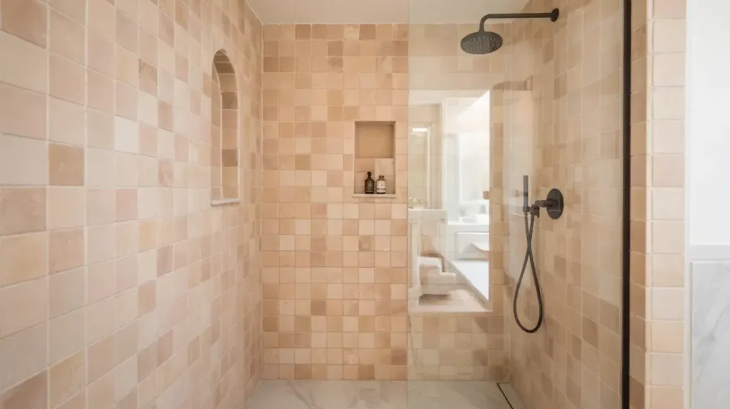 One stunning approach I’ve seen: use the same pink tile on walls and floors but in different sizes. Large format on walls, small format (like penny tiles) on the floor. It creates cohesion while maintaining visual interest.