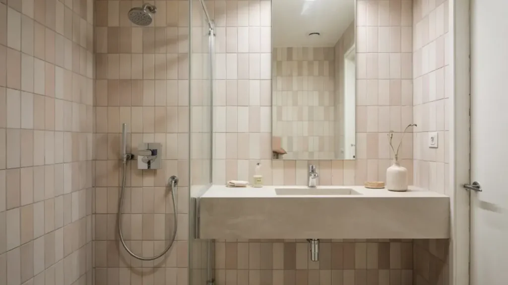 The minimalist approach requires choosing the right pink tile—go for large format tiles in a muted, almost neutral pink. The fewer grout lines, the cleaner the look. Think 12×24 inch tiles or even larger.