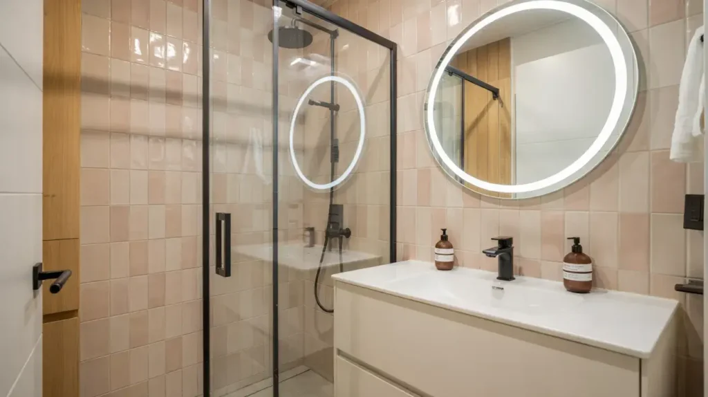 Pair your pink tiles with modern fixtures in black matte or brushed brass. I’m talking geometric mirrors, floating vanities, and rainfall showerheads. The contrast between soft pink and hard-edged metal creates this perfect balance that feels fresh and intentional.