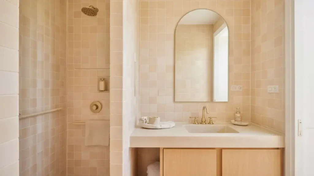 The key to minimalist pink tile bathrooms is what you don’t include. Every item needs to earn its place. That decorative soap dispenser? Probably not making the cut. That vintage perfume bottle collection? Doesn’t fit the vibe.