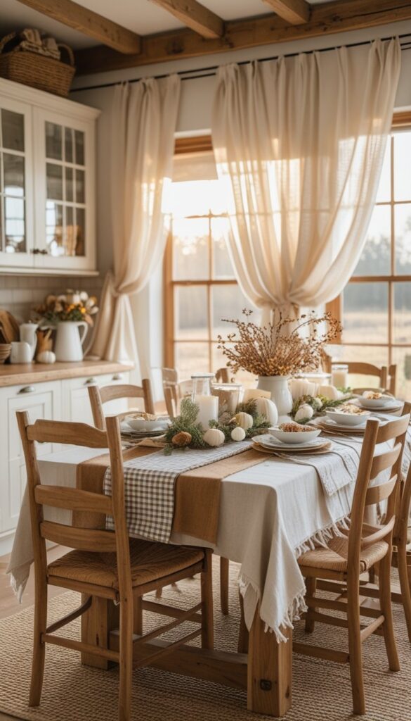 Textured fabrics play a big role in creating a rustic kitchen vibe. Soft linens can add warmth to the space, making it feel inviting and cozy. The light, airy curtains in the image allow natural light to flow in while still providing some privacy. This balance is key in a rustic kitchen.