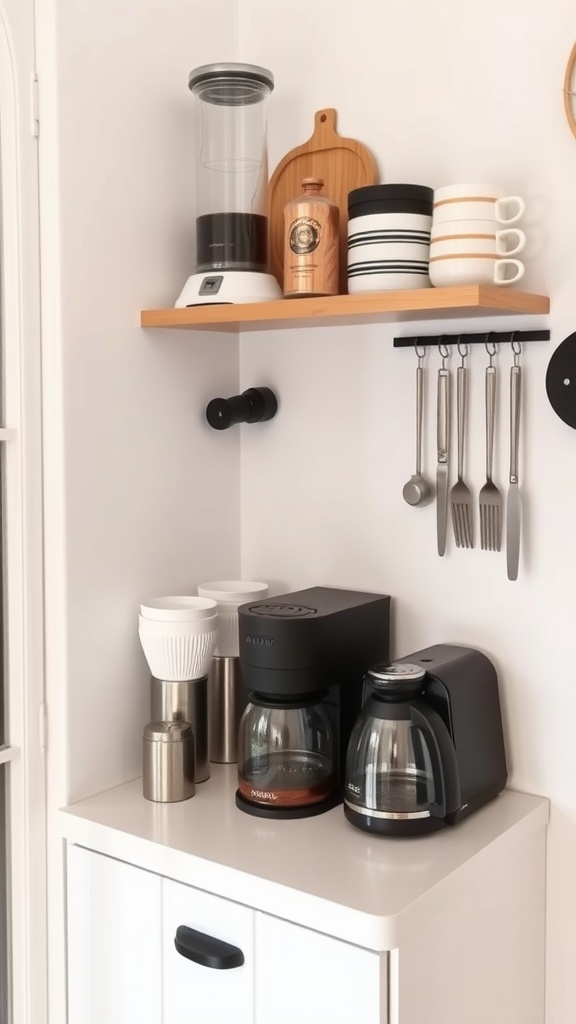 A multi-functional kitchen appliance station is a great way to bring efficiency and style to your coffee routine. The image showcases a neat setup where various coffee-making tools are organized in a compact space. You can see a sleek coffee maker and a kettle, which makes brewing coffee a breeze. Let’s not overlook the accessories like measuring cups and utensils hanging on the wall, adding to both convenience and aesthetics.