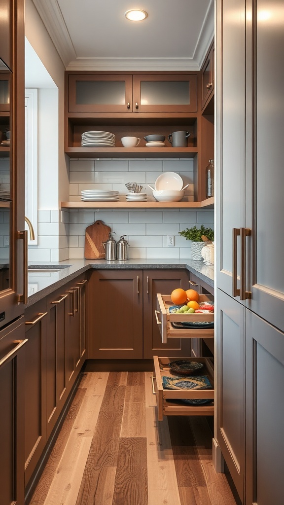 The upper shelves hold dishes and cups, keeping them out of the way but easily accessible. The lower cabinets have pull-out drawers, ideal for storing fruits and other kitchen essentials. This setup not only keeps everything neat but also allows for quick access when cooking.