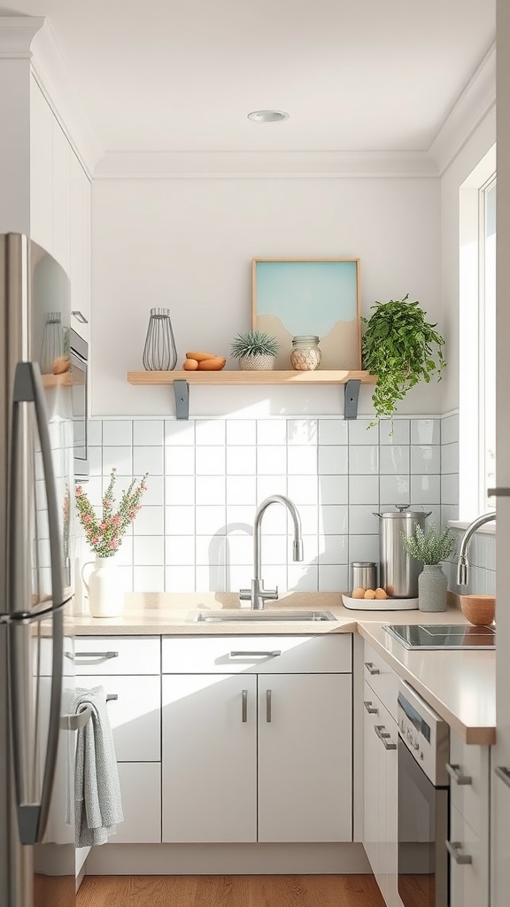 Storage is also key. Open shelves above the countertop not only keep essentials close at hand but also showcase decorative items like plants and mugs. This clever setup encourages a light, airy vibe, which is essential in a compact area.