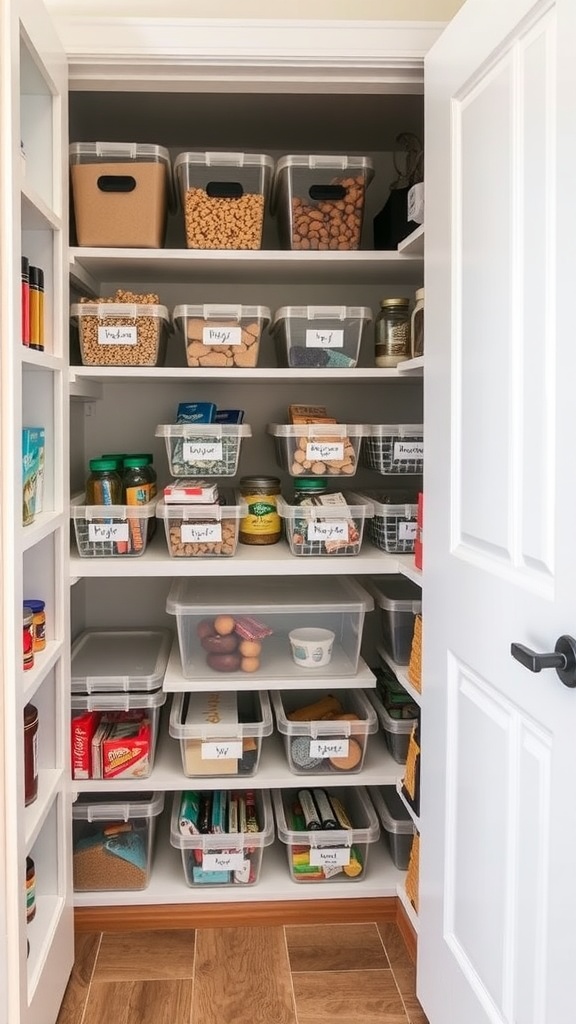 Stackable storage bins are a fantastic solution for small kitchen spaces. They maximize vertical space while keeping everything organized. In the image, you see a well-arranged pantry with various clear bins. Each bin houses different items, making it easy to find what you need.