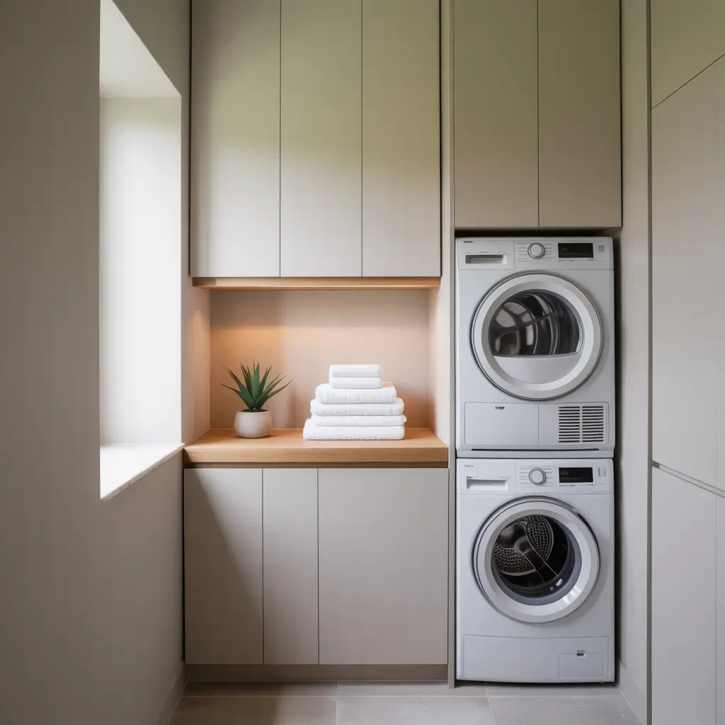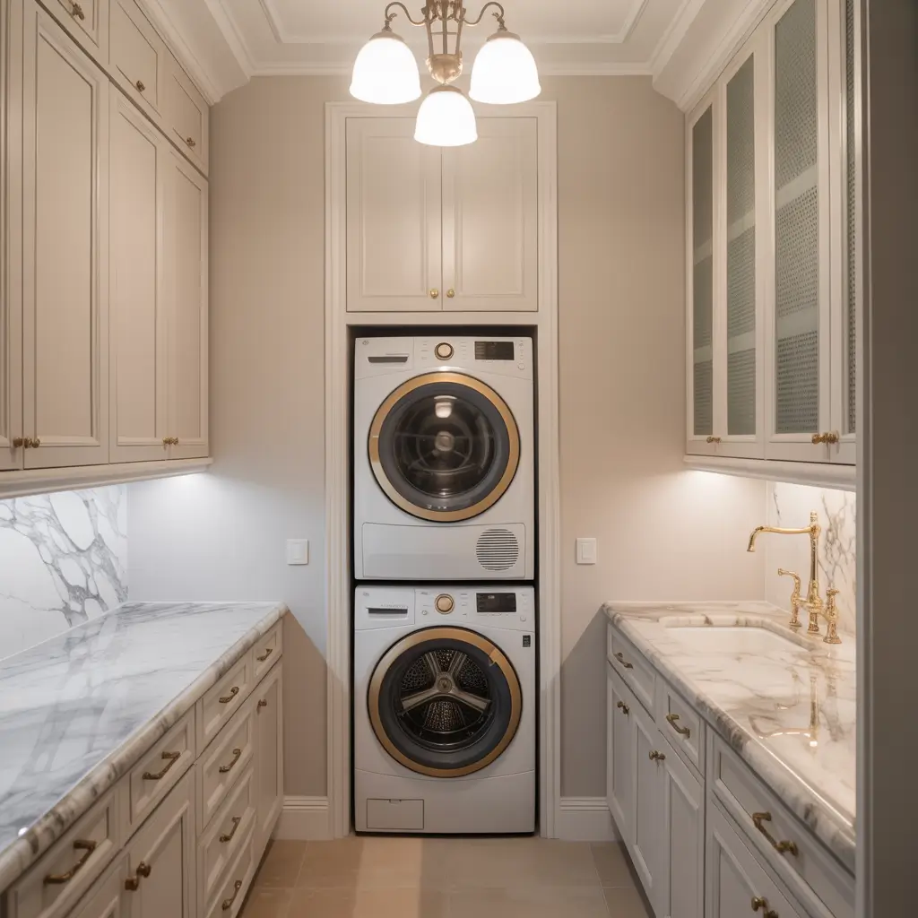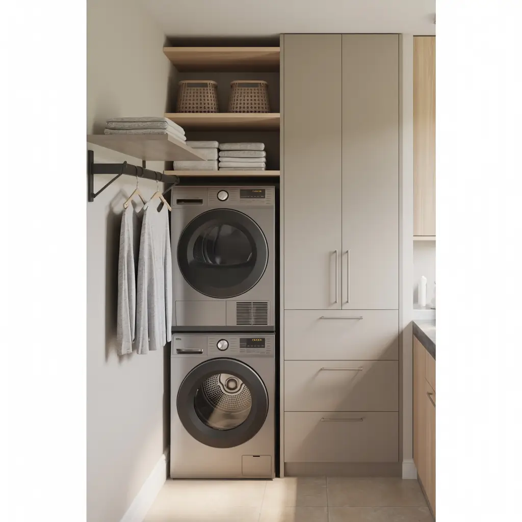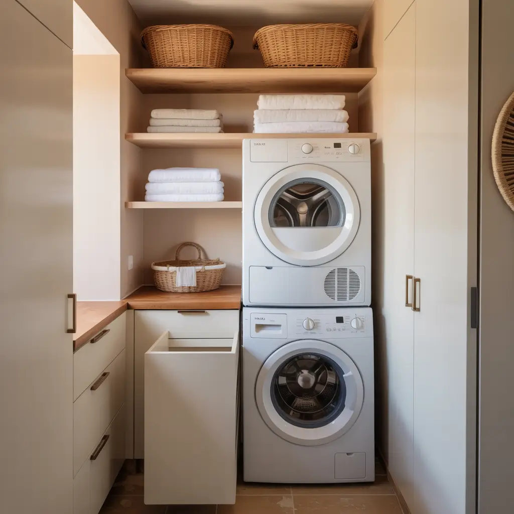 When designing around stackable machines, think about what goes on the walls beside them. I’ve seen people install narrow pull-out cabinets (those things that are only 6 inches wide) next to their stacked units, and they’re perfect for storing cleaning supplies without taking up visual space.