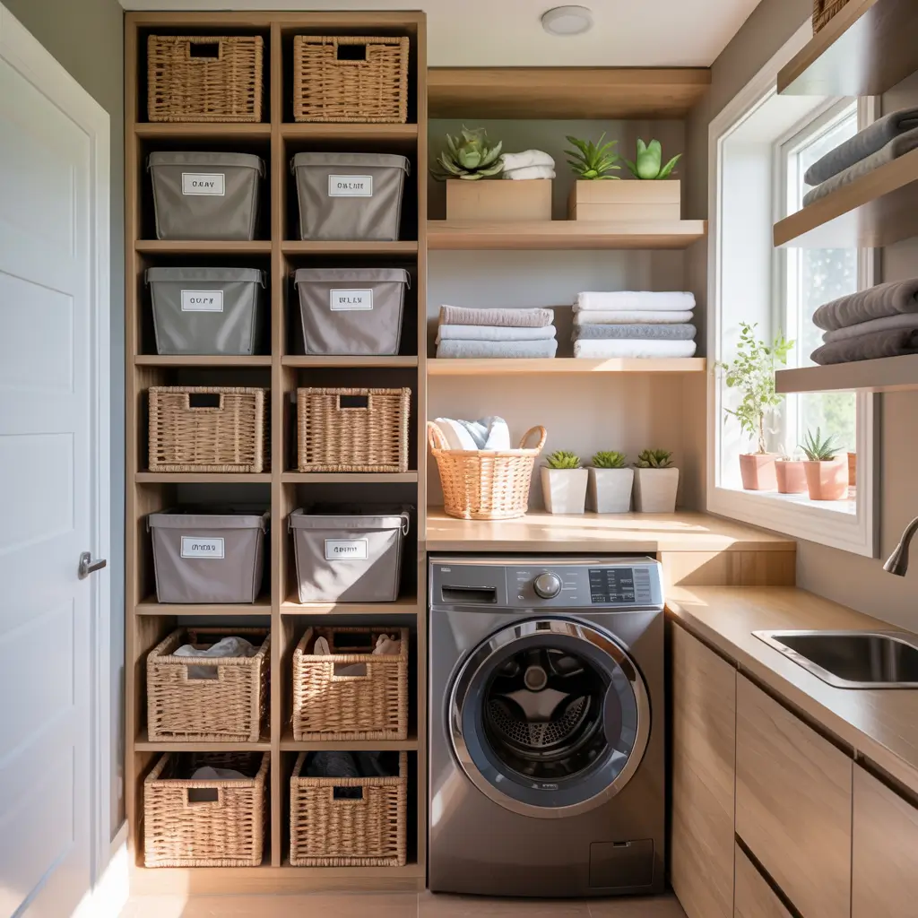 - Labeled baskets for sorting—whites, darks, colors, and that mysterious fourth category we all have