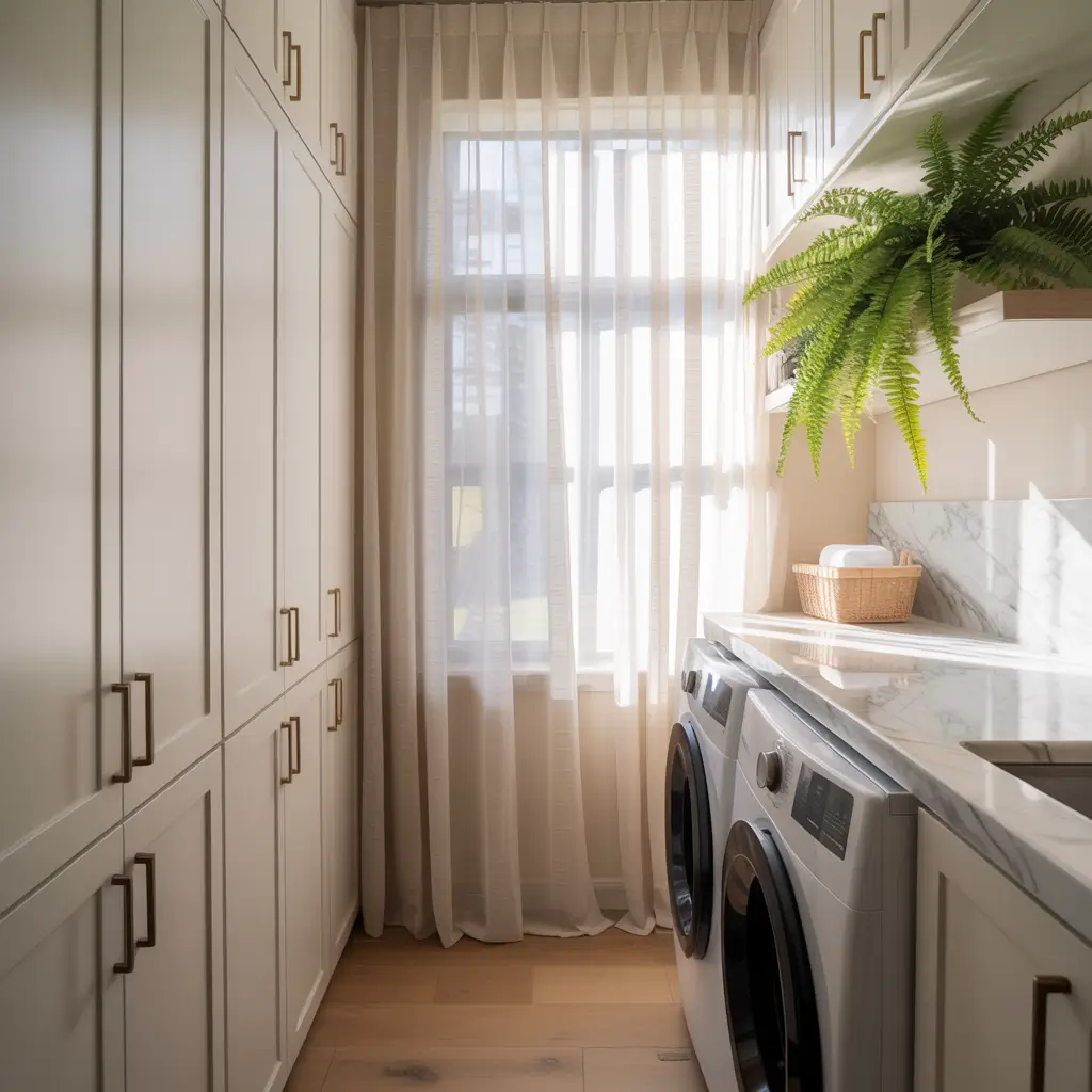 The trick with built-ins is making them work around your machines. Measure everything twice, then measure again, because cutting cabinet space too tight means you can’t fit your washer through the opening. Been there, cried about that.