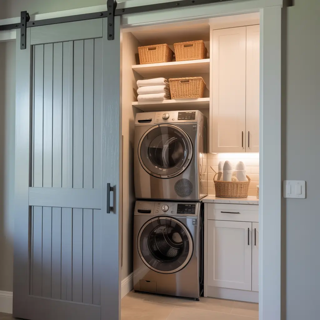 Traditional swinging doors eat up space that you simply don’t have in a small laundry room. Sliding doors (barn doors, pocket doors, or even curtains) free up that floor space and often look better anyway.