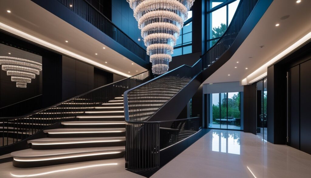 Oversized pendant lights or cascading chandeliers above a staircase add drama and elegance. The lighting enhances architectural details while ensuring the stairs remain safe and well-lit. Metallic finishes bring a touch of sophistication.
