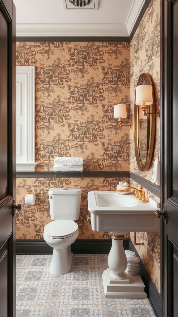 This particular design features intricate patterns that draw the eye. The contrast of the dark damask against the lighter background adds depth and texture, making the space feel more luxurious. Pairing this with simple, elegant fixtures like the white pedestal sink and toilet creates a lovely balance.