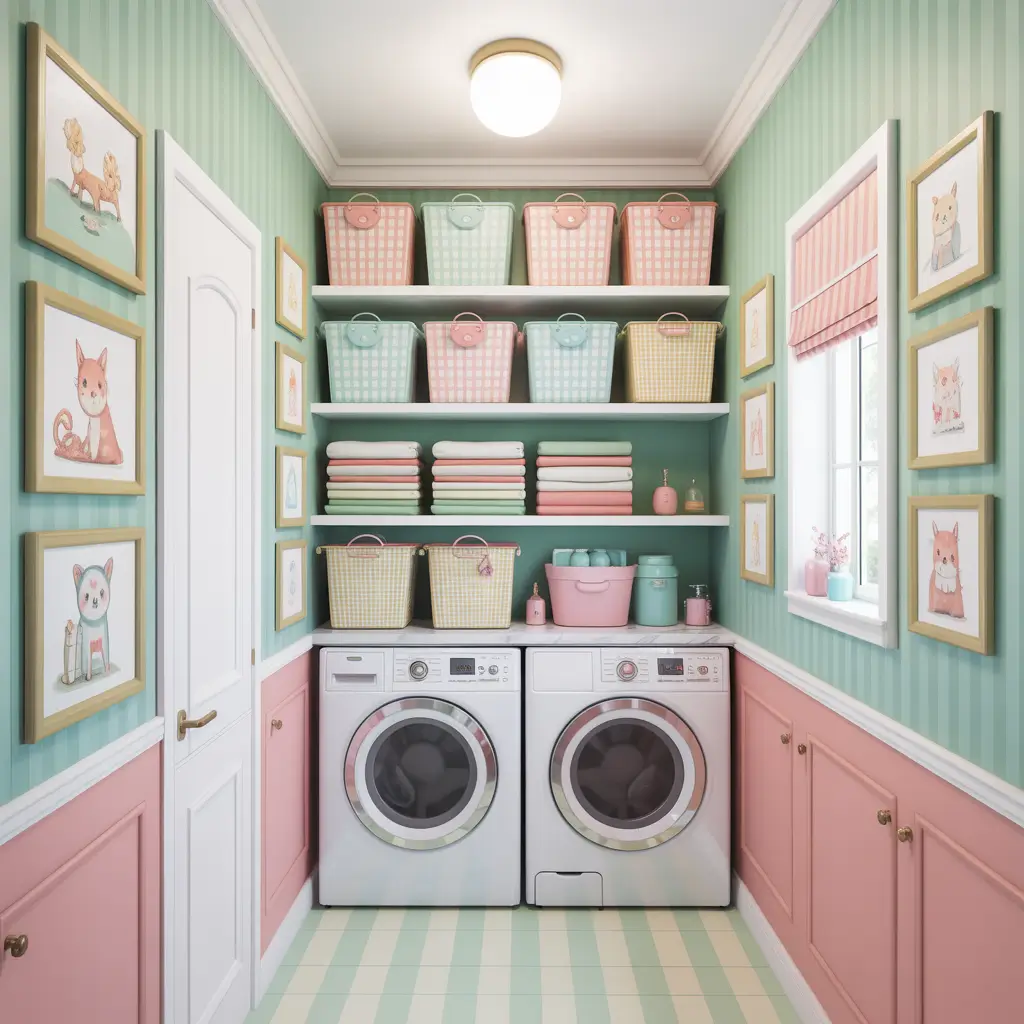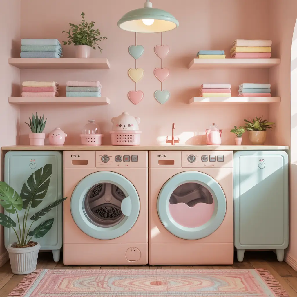 The trick with pastel aesthetics? You want everything to look cohesive without being matchy-matchy. Mix your pastels—pair that lavender with some soft peach, throw in some mint green. The goal is creating a space that feels gentle and calming, like your characters actually enjoy doing laundry here. (Wild concept, I know.)