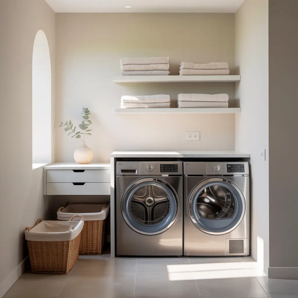 What I love about this style is how quick it is to set up. You’re not spending forever choosing between seventeen different decorative items. You pick the essentials, arrange them with plenty of breathing room, and boom—you’ve got yourself a laundry room that looks like it belongs in an architecture magazine.