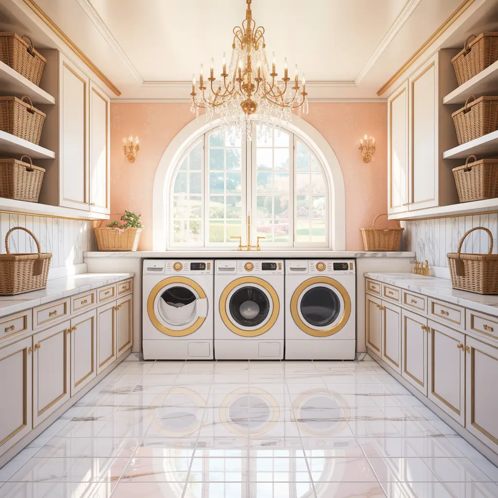 This layout screams “I have money and I’m not afraid to spend it on making laundry glamorous.” We’re talking chandelier-level fancy here, folks.