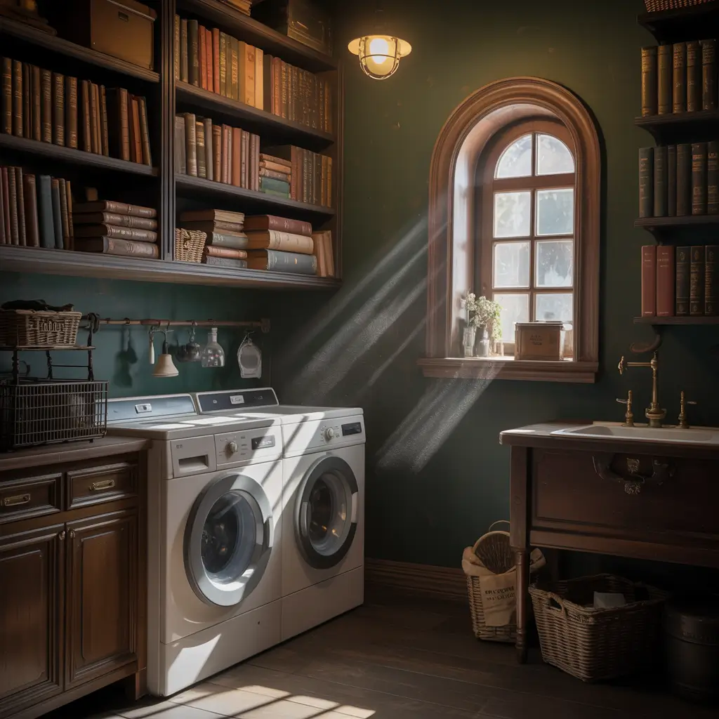 Okay, hear me out. A Dark Academia laundry room sounds weird, but it’s actually chef’s kiss when done right. This aesthetic brings those moody, intellectual vibes to the most mundane household task. Your characters aren’t just washing clothes—they’re contemplating poetry between rinse cycles.
