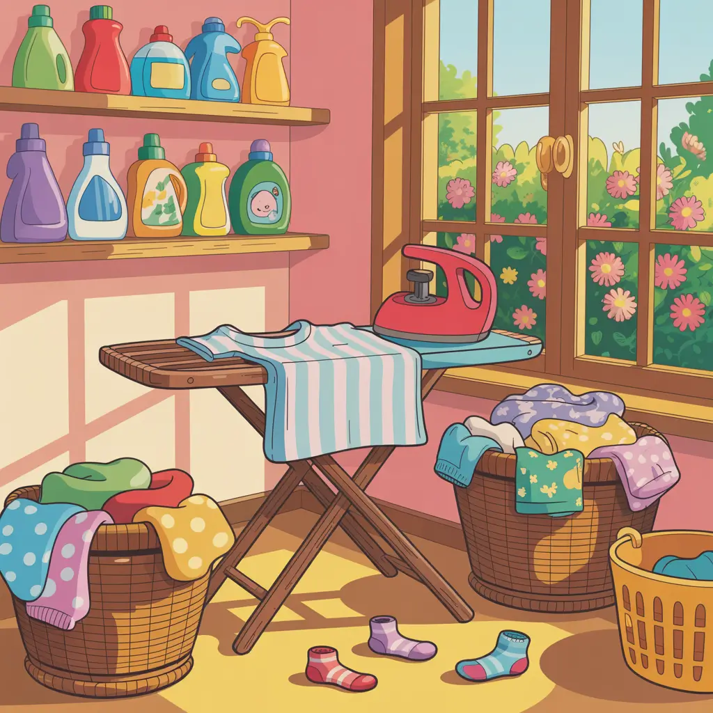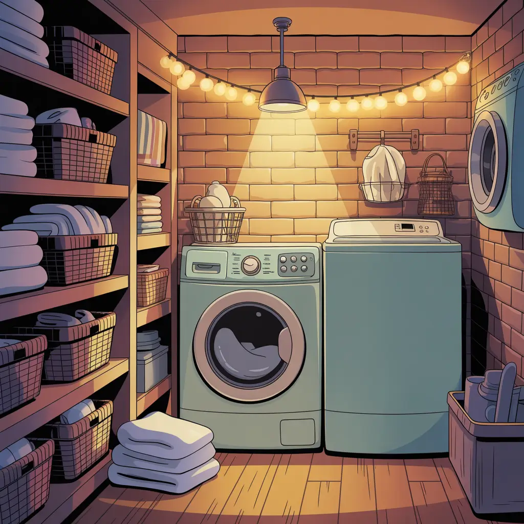 The color scheme can be anything, but I usually keep it practical and homey—this is a working laundry room, after all. It should feel like a space where actual laundry happens, where characters have conversations while folding clothes, where real life unfolds.