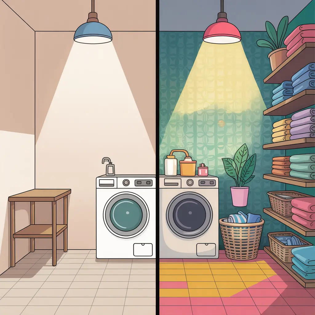 I usually pick a specific aesthetic for the after version. Maybe you’re transforming a boring basement laundry into a cheerful rainbow room, or upgrading a cluttered corner into a sleek minimalist space. The contrast is what makes it impactful.