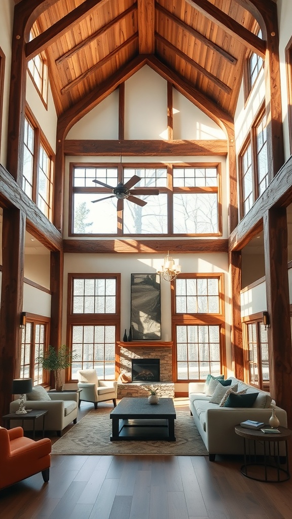 Natural light floods in through big windows, enhancing the welcoming vibe. Houseplants add a touch of greenery, making the space feel alive and fresh. The wooden beams overhead complement the warm tones of the hardwood floor, tying everything together beautifully.