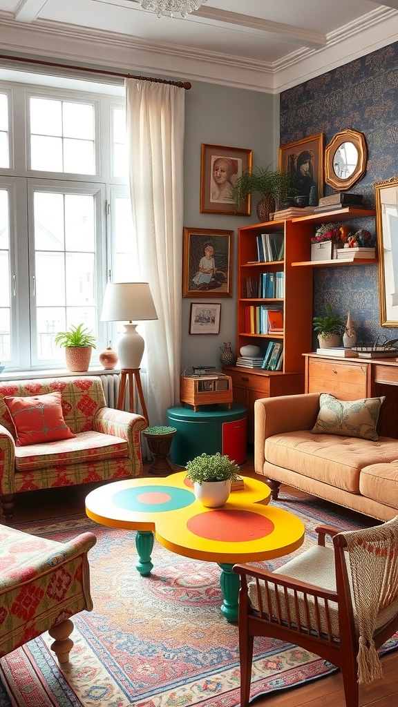 In this whimsical living room, the blend of furniture styles creates a playful yet inviting space. The vibrant colors and unique shapes immediately grab attention.