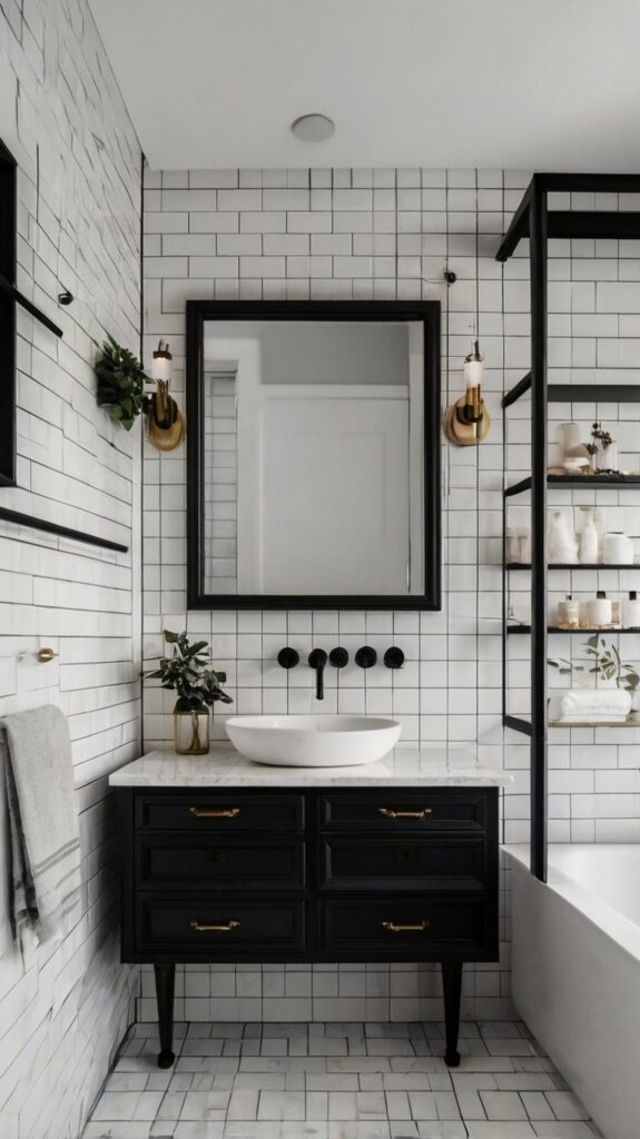 Create a clean, dramatic effect by running white tiles with black grout from floor to ceiling. This makes the room feel taller and visually striking. Use matte finishes and large mirrors to enhance the effect.
